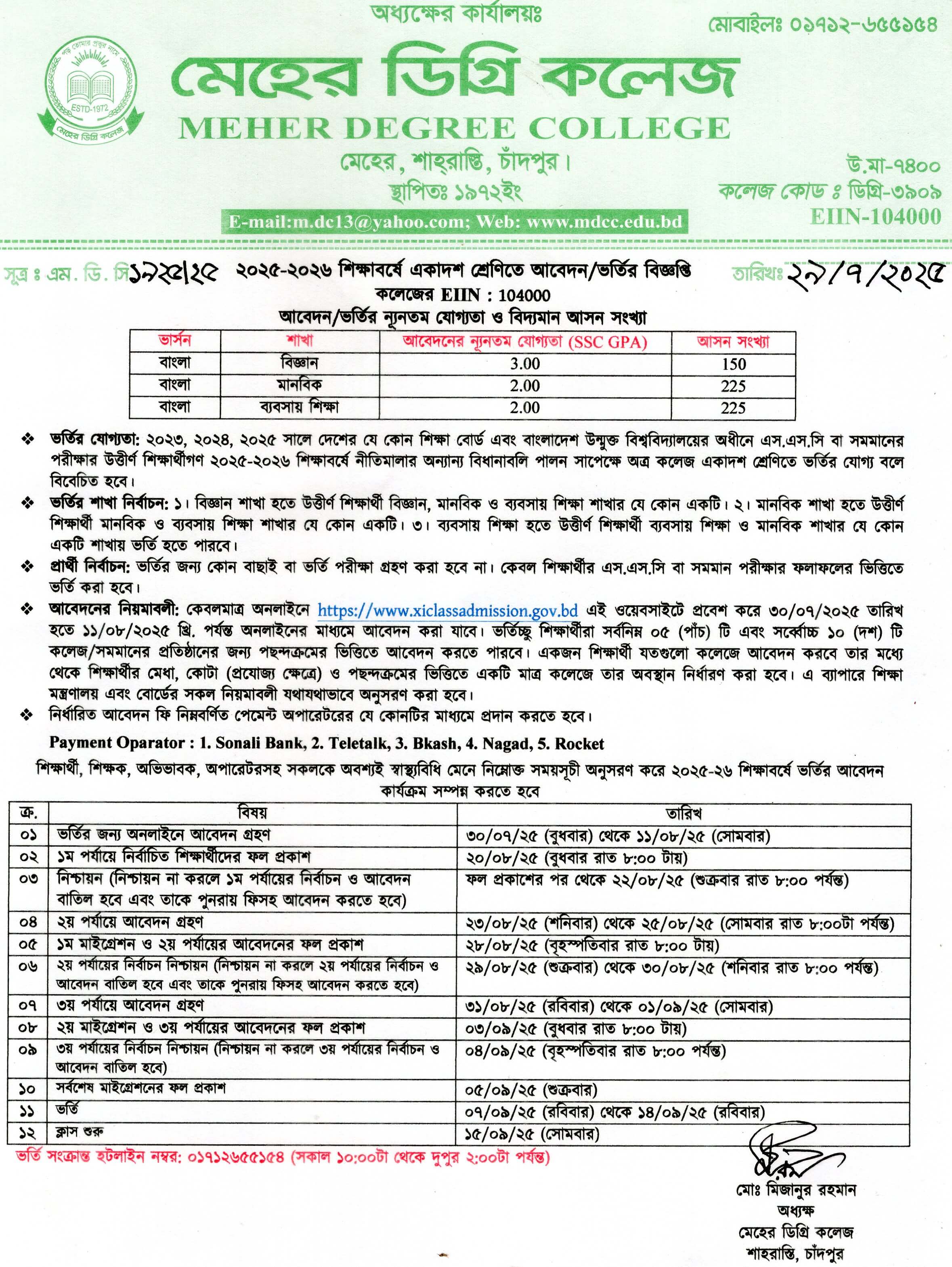 ২০২৫-২০২৬ শিক্ষাবর্ষে একাদশ শ্রেণিতে আবেদন/ভর্তির বিজ্ঞপ্তি
